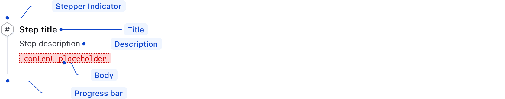 Using the named <:title> block is required. Additional information for a step is added through the named blocks <:description> and <:content>.